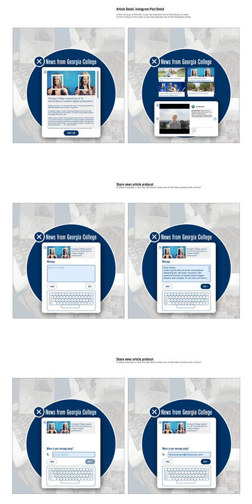 In these mockups, a user selects an article to read, chooses to share it, and goes through the steps of sharing it with a friend.