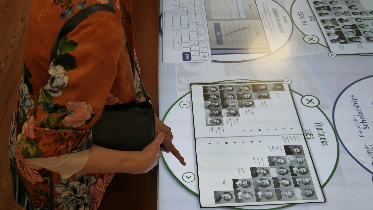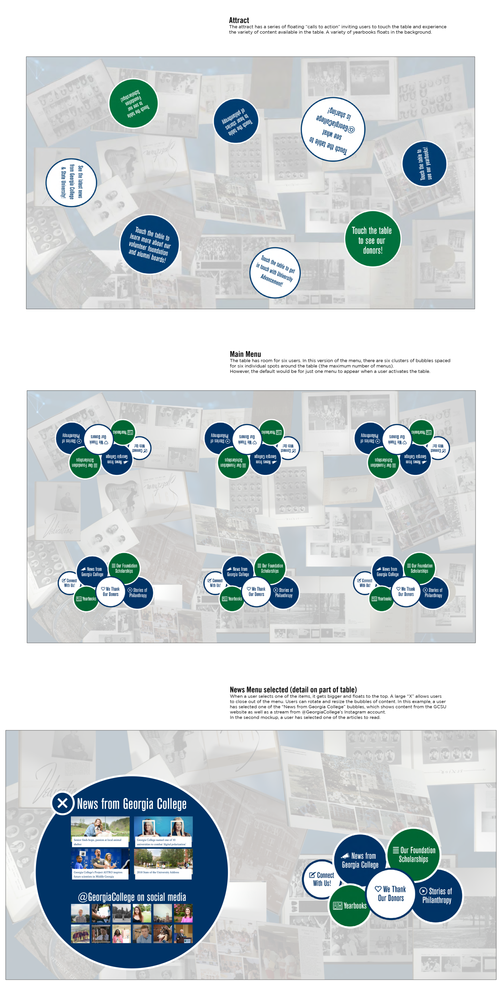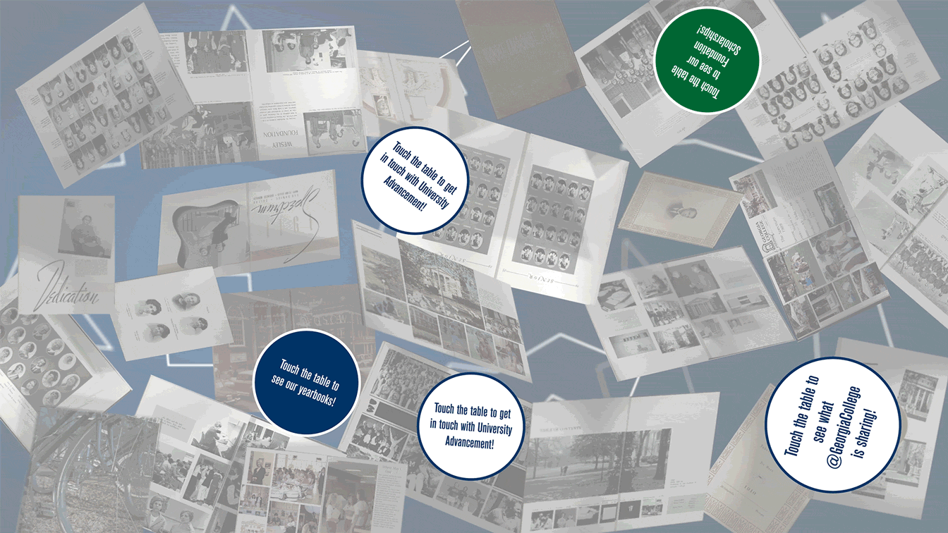 The attract is a series of floating “calls to action” inviting users to touch the table and experience the variety of content in the table. Yearbooks float in the background.