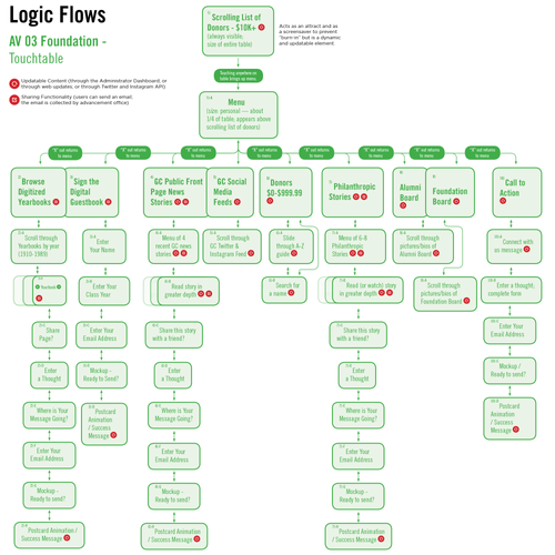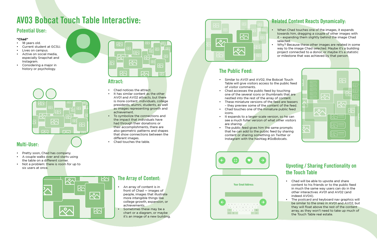 It was important for me that we show the client a fleshed-out user journey map at the beginning of the project. This user journey responded to the exhibit designer’s initial description of the experience, and imagined a user named “Chad,” going on a journey of experiencing this touch table.