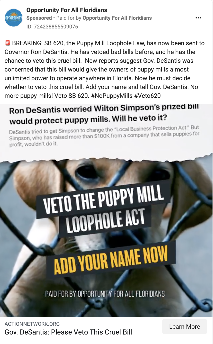 🚨 BREAKING: SB 620, the Puppy Mill Loophole Law, has now been sent to Governor Ron DeSantis. He has vetoed bad bills before, and he has the chance to veto this cruel bill. New reports suggest Gov. DeSantis was concerned that this bill would give the owners of puppy mills almost unlimited power to operate anywhere in Florida. Now he must decide whether to veto this cruel bill. Add your name and tell Gov. DeSantis: No more puppy mills! Veto SB 620. #NoPuppyMills #Veto620